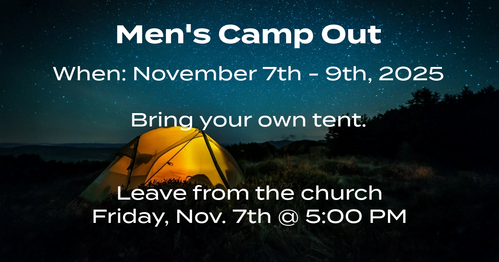 Our Men's Group will be having a camp out November 7th through 9th. Attendees will need to bring their own tents, etc. and the group will leave from the curch at 5 pm on Friday November 7th. For more information, reach out to a Men's Group Leader.