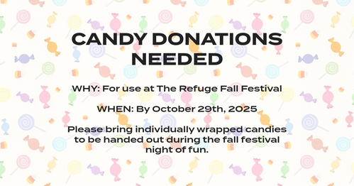 We are in need of individually wrapped candy donations which will be handed out at this years Fall Festival on October 30th. Please drop donations in the donation box in the foyer.