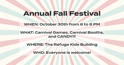 Our Annual Fall Festival will be going back indoors this year with a carnival theme! There will be carnival games, booths, and candy! Please join us from 6 to 8 pm on October 30th for a come and go carnival themed festival in our kids building.